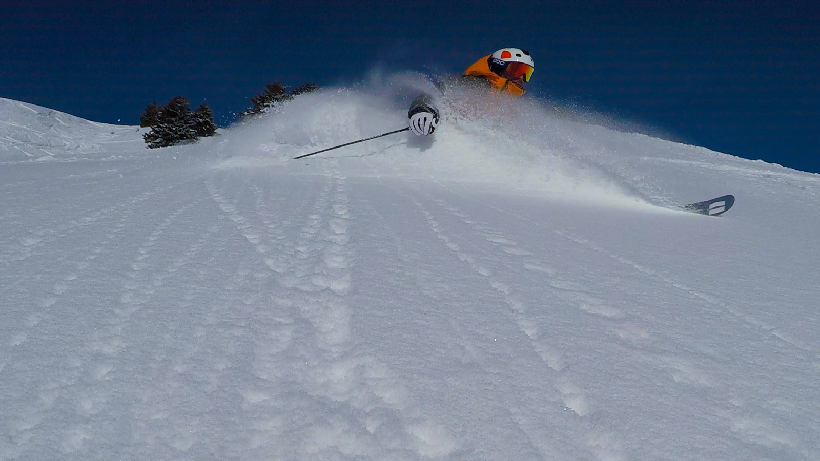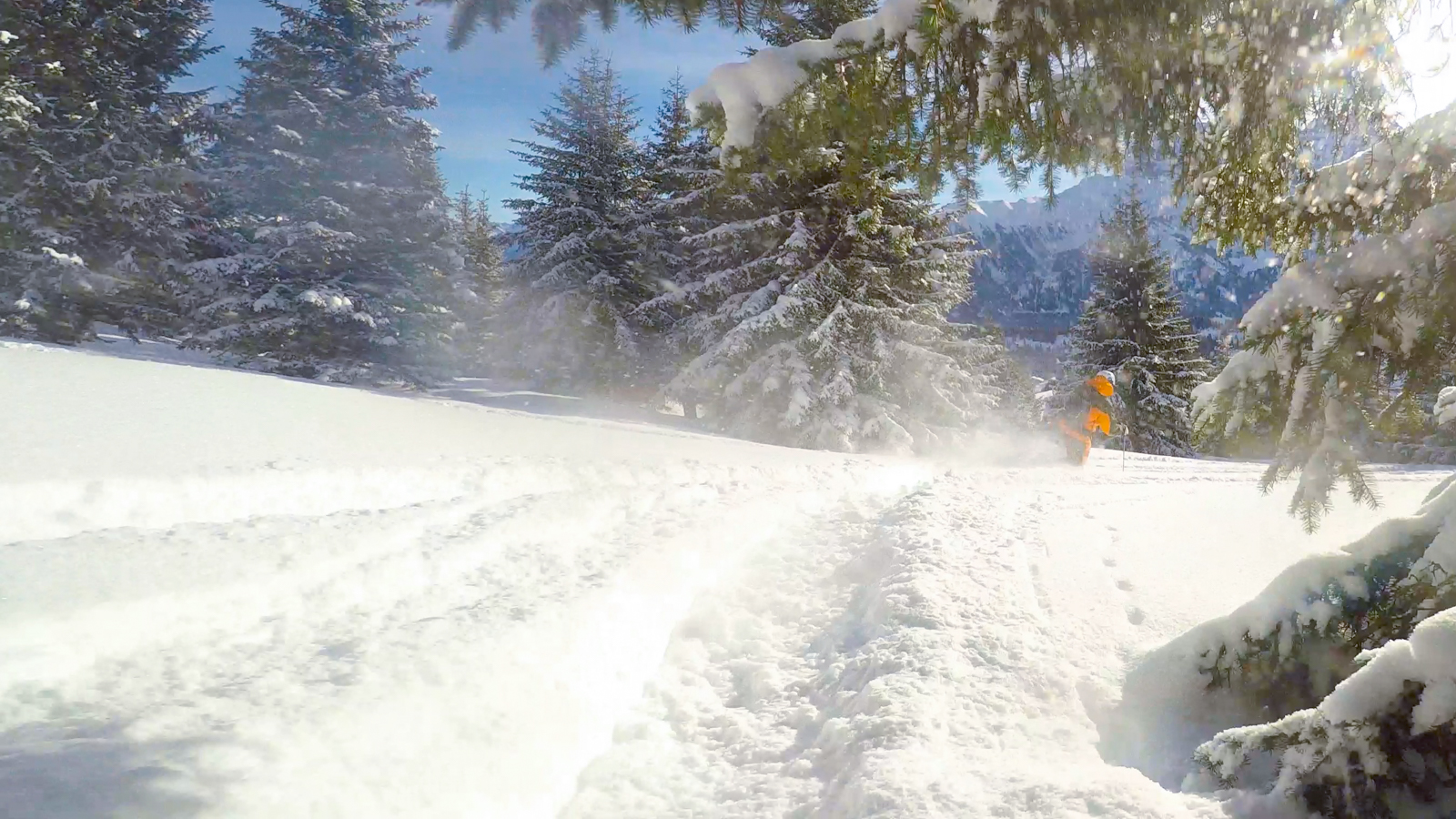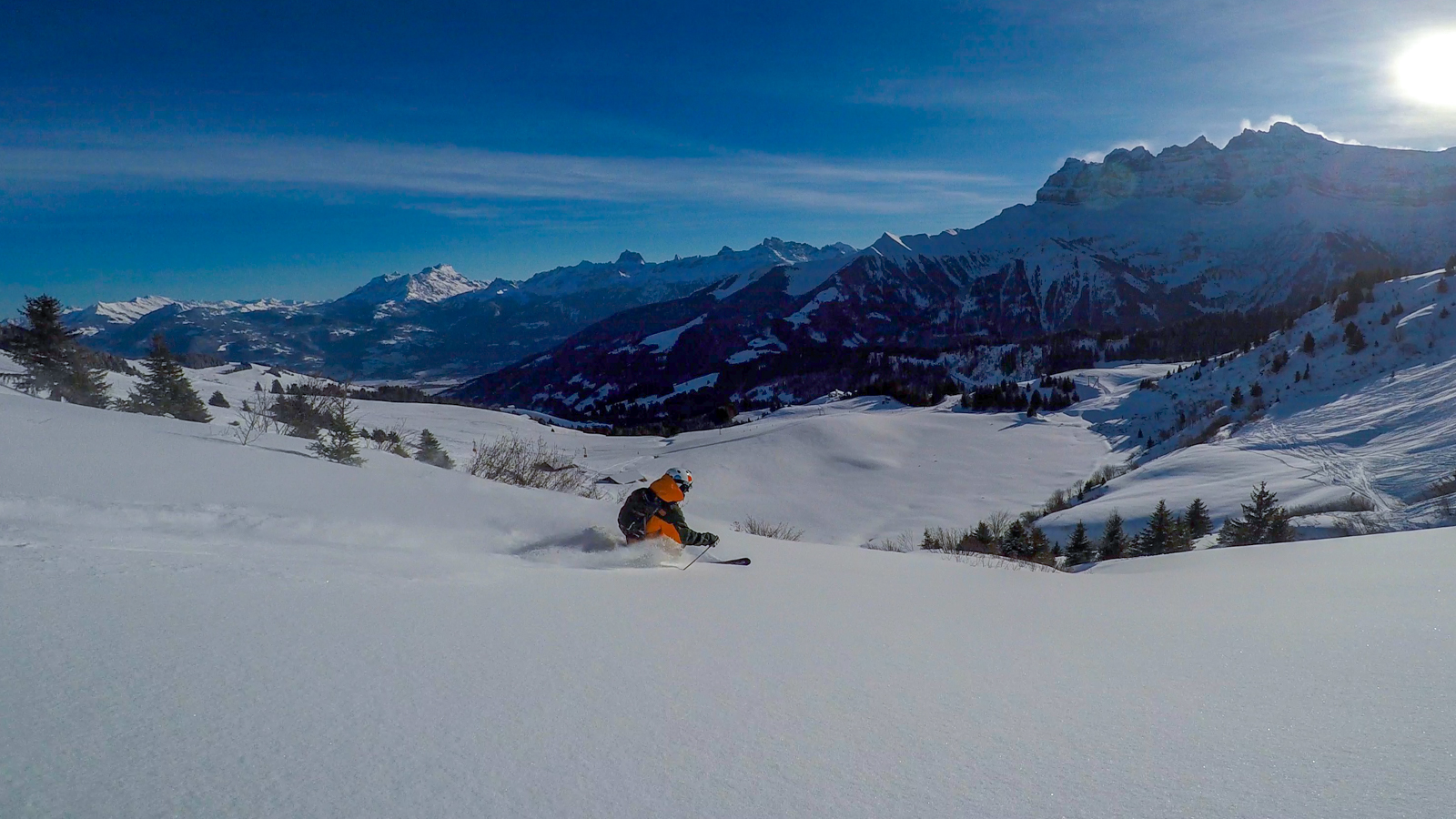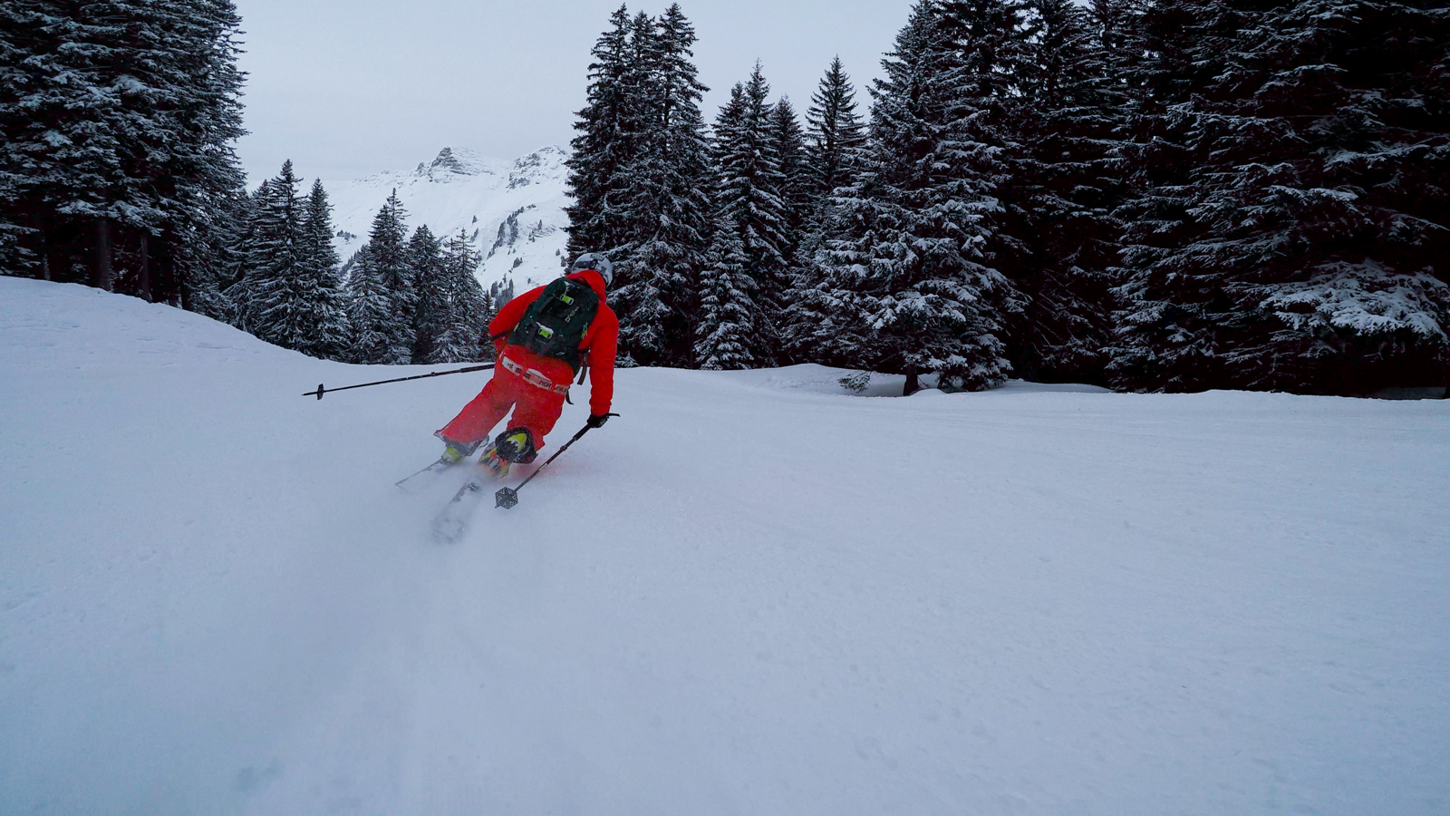 Une petite matinée sous un soleil radieux, dans une poudreuse plus qu’abondante. Le ciel se couvre alors gentiment, le vent se lève, le temps pour nous de rejoindre la station par un petit passage en forêt.