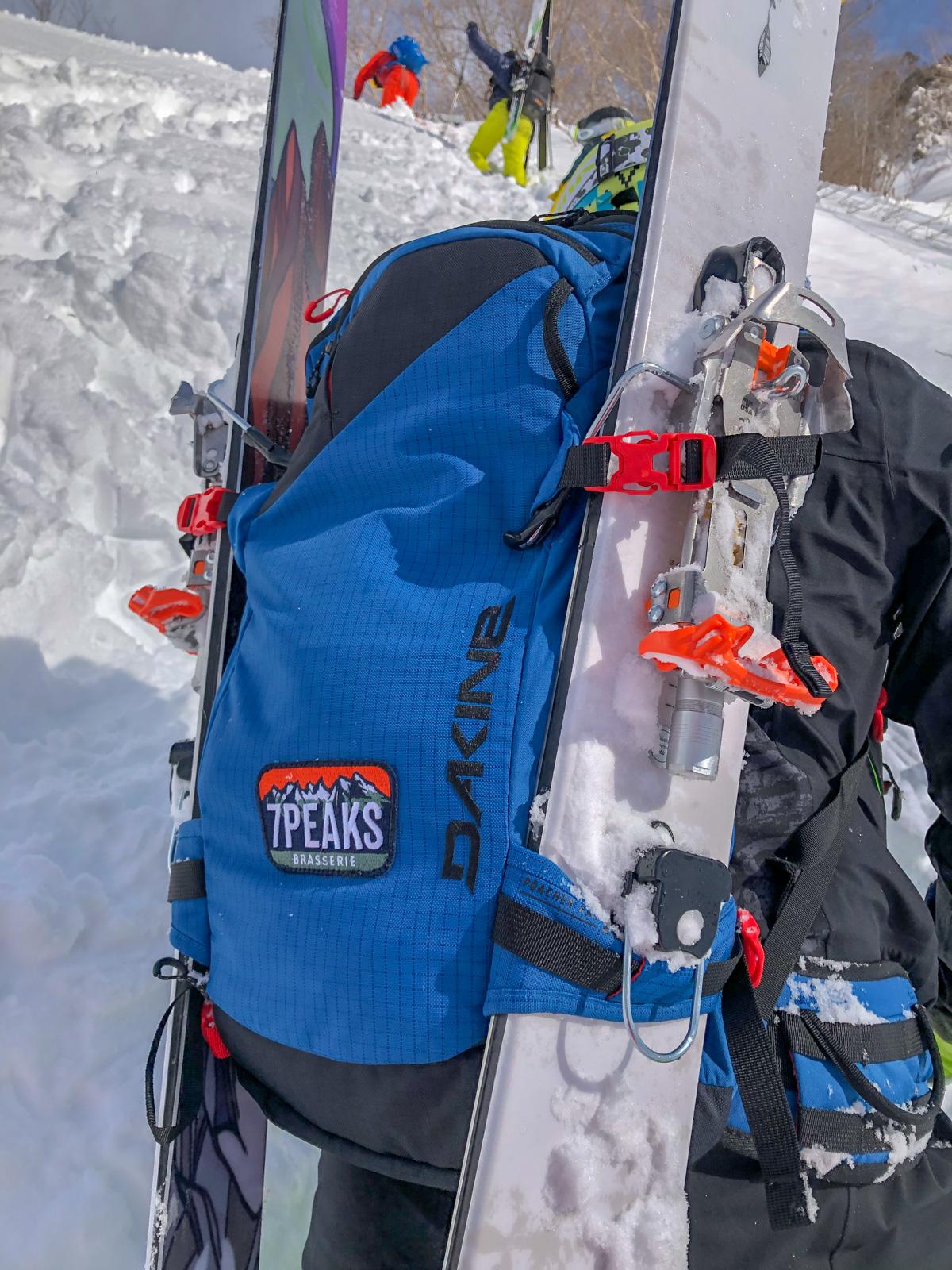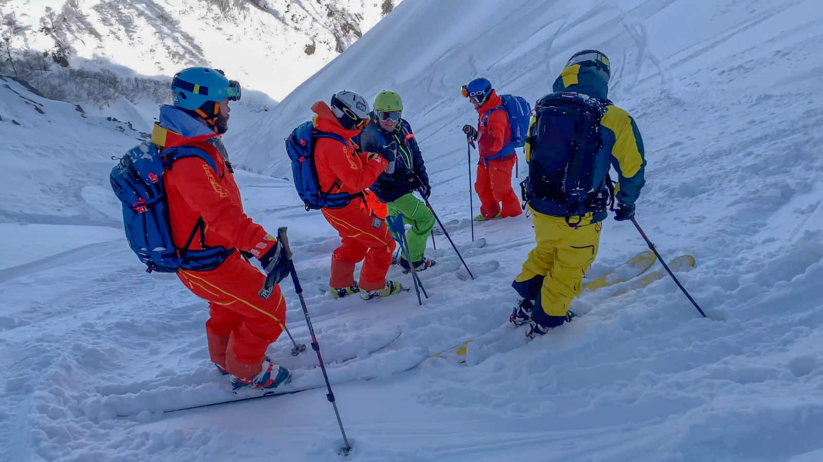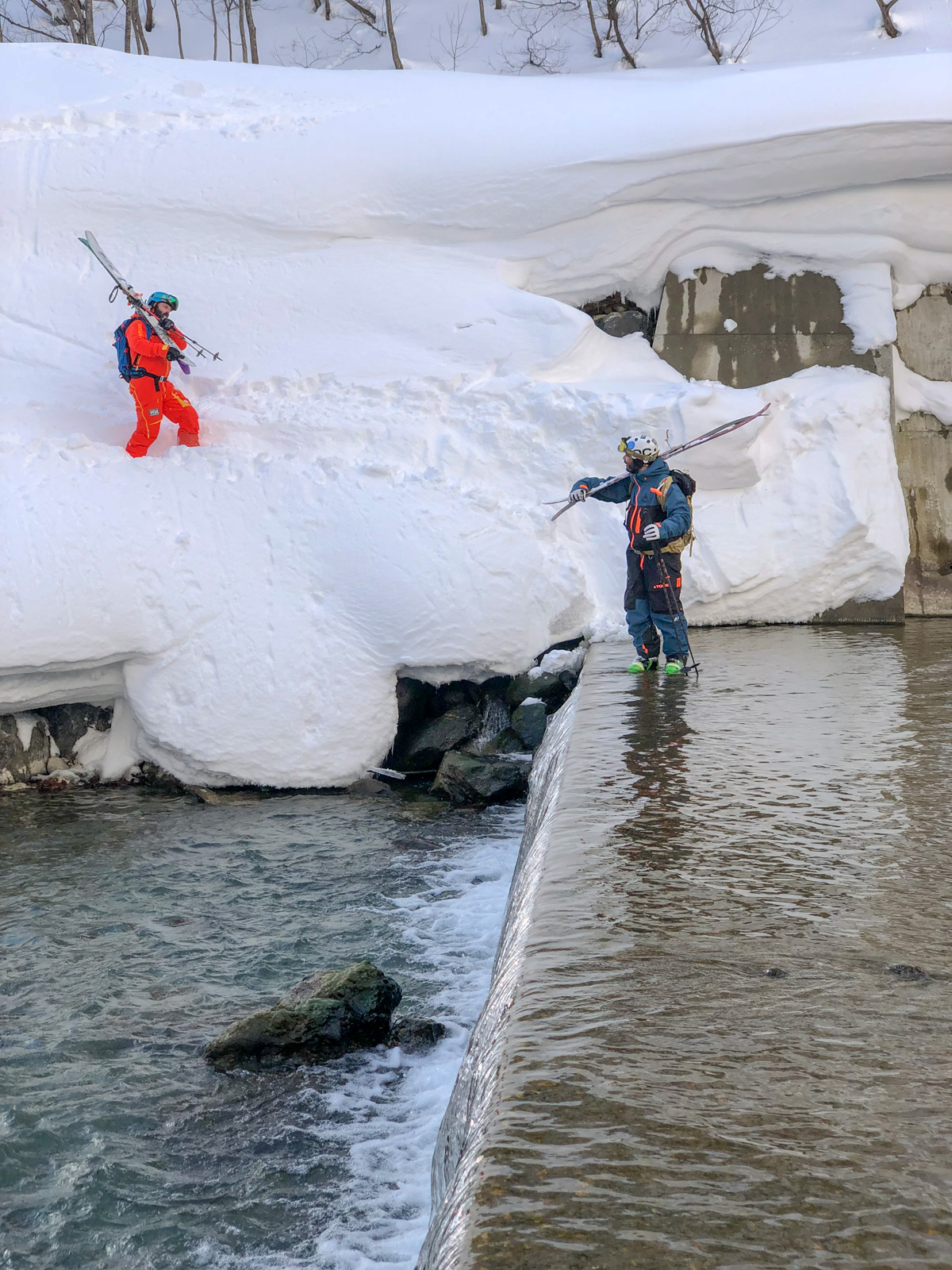 Cela fait 5 jours qu’il n’a pas neigé dans la vallée, il va falloir monter en peaux pour trouver un spot idéal, chose que nous faisons dès le premier jour. Une belle montée (pas évidente pour tout le monde, hein Marc ?!). Place maintenant à la descente! Grâce à Seb, rencontré au lodge et qui nous accompagne ce jour, nous descendons donc cette face nord pour nous retrouver nez-à-nez avec une cascade infranchissable. Il faut alors remonter pour la contourner, nous traversons ensuite rivières et routes avant de trouver un taxi. Une longue descente, très longue… La fatigue est présente, le jetlag aussi… La machine à souvenirs est en marche.