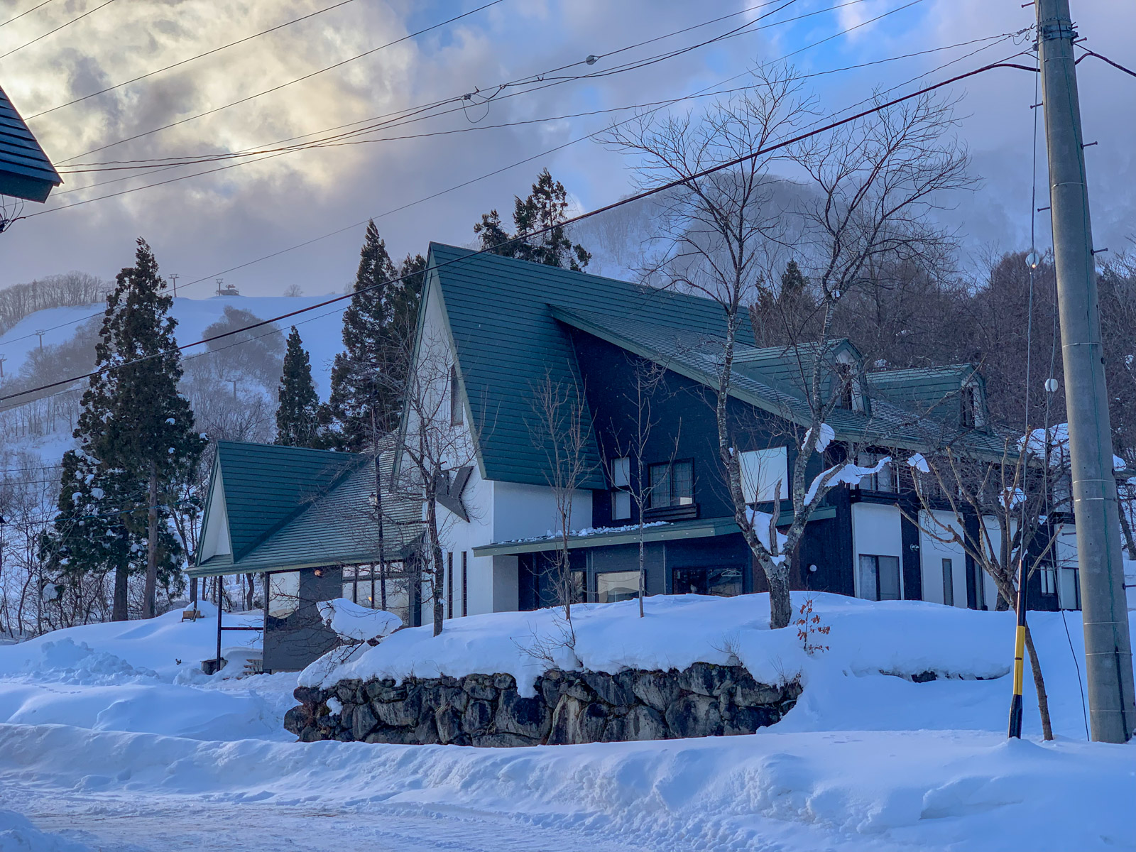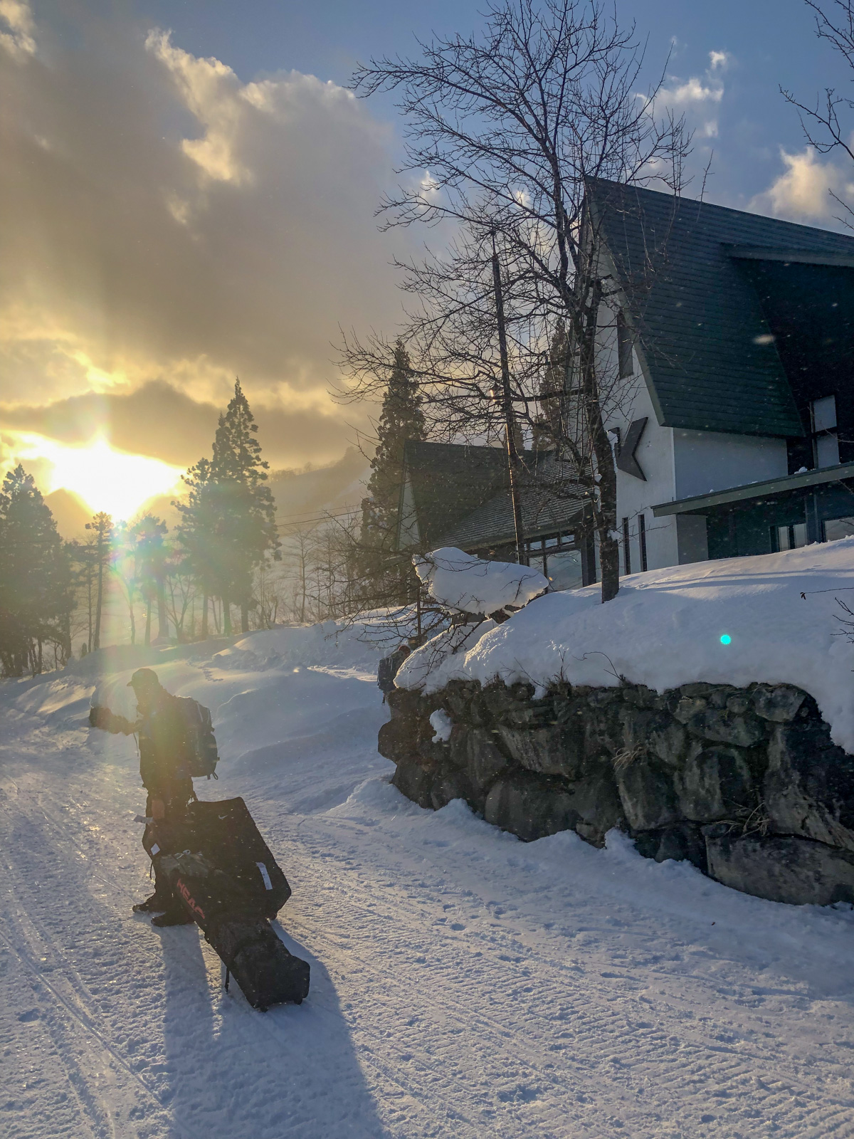 Dimanche 13 janvier, 16h, après 13h de vol, 5h de bus, le retrait d’une cartouche d’airbag à l’aéroport de Zürich, quelques verres et quelques siestes, nous arrivons enfin au Kodama Lodge dans la vallée d’Hakuba à 1h30 de Nagano. Prise des chambres, déballage du matériel, apéro de bienvenue! C’est un plaisir de revoir Géraldine et Simon, nos amis suisses, propriétaires du lodge.