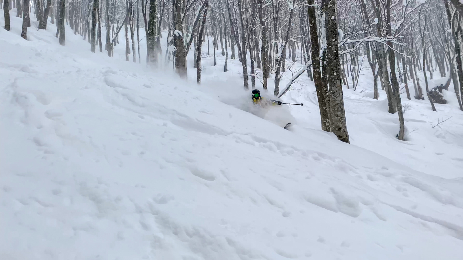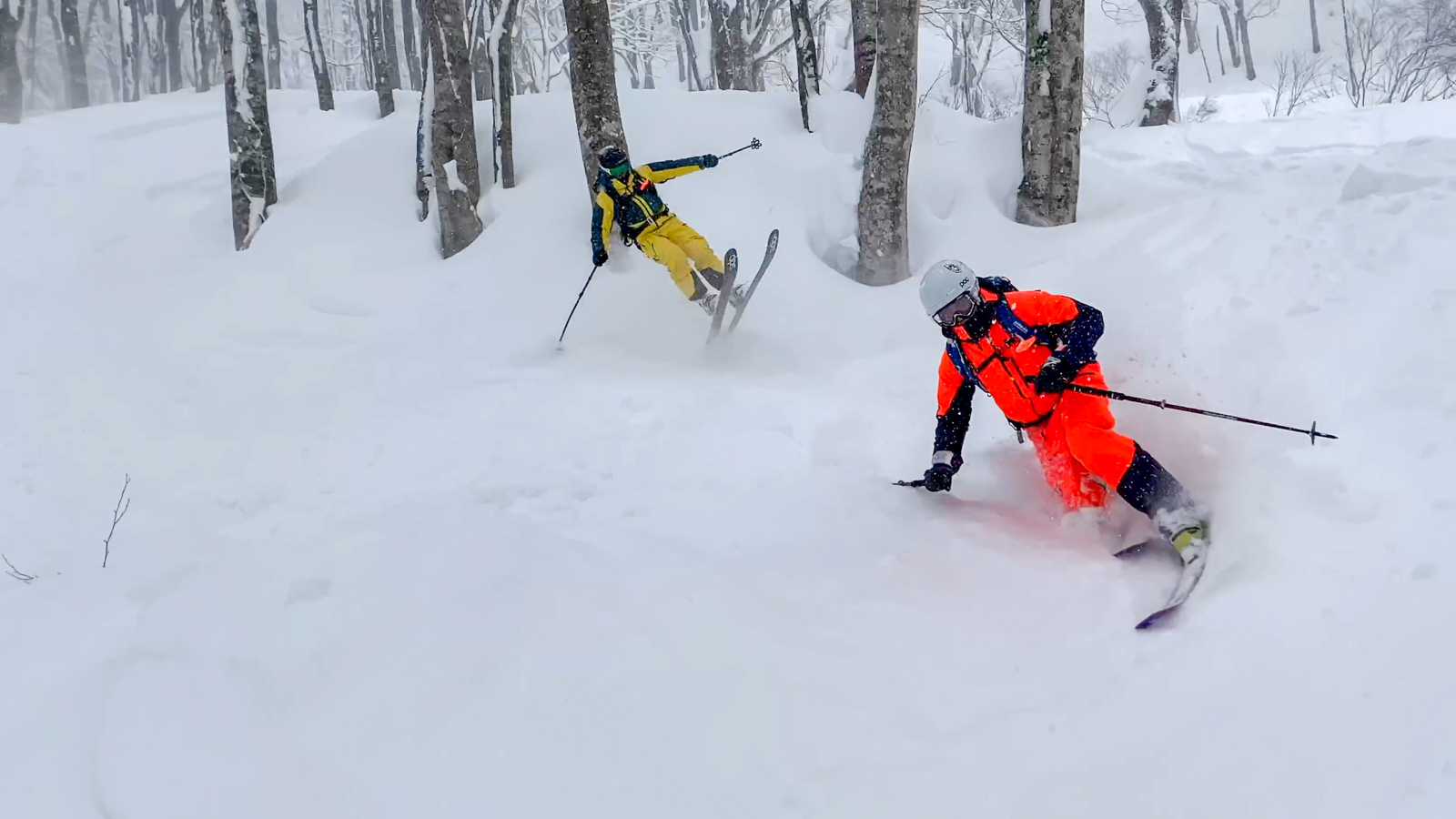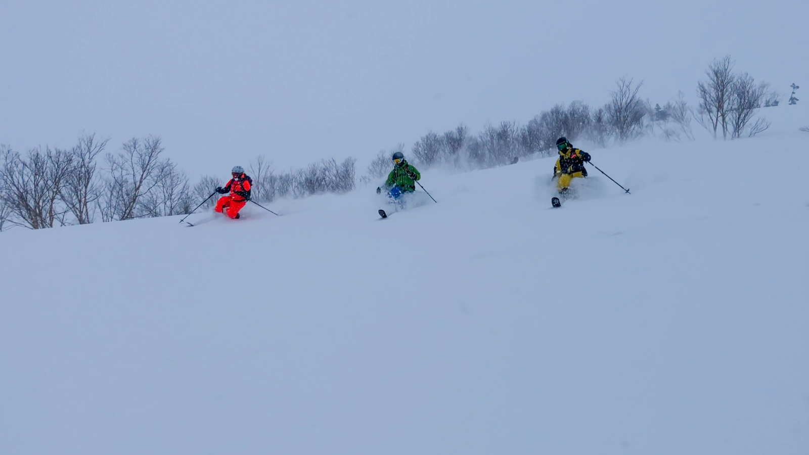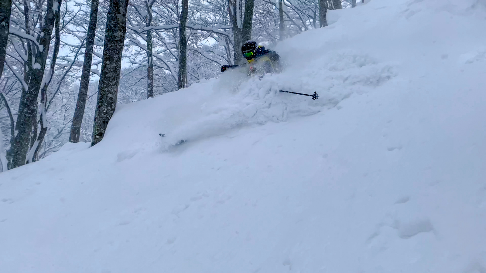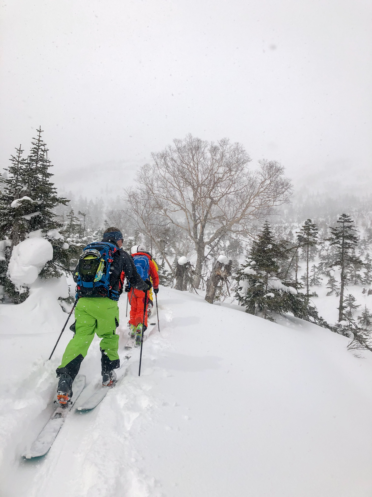 Du mercredi au vendredi, nous jouons ainsi dans les forêts de bouleaux. Quel bonheur de goûter à cette neige si légère et en si grande quantité. Le jeudi, un local nommé Schuichi, qui nous suit sur internet, se joint à nous pour nous faire découvrir un tour en peaux. Avec une météo qui se dégrade de plus en plus, une partie du groupe se retrouve alors dans la tempête. Une charmante expérience…