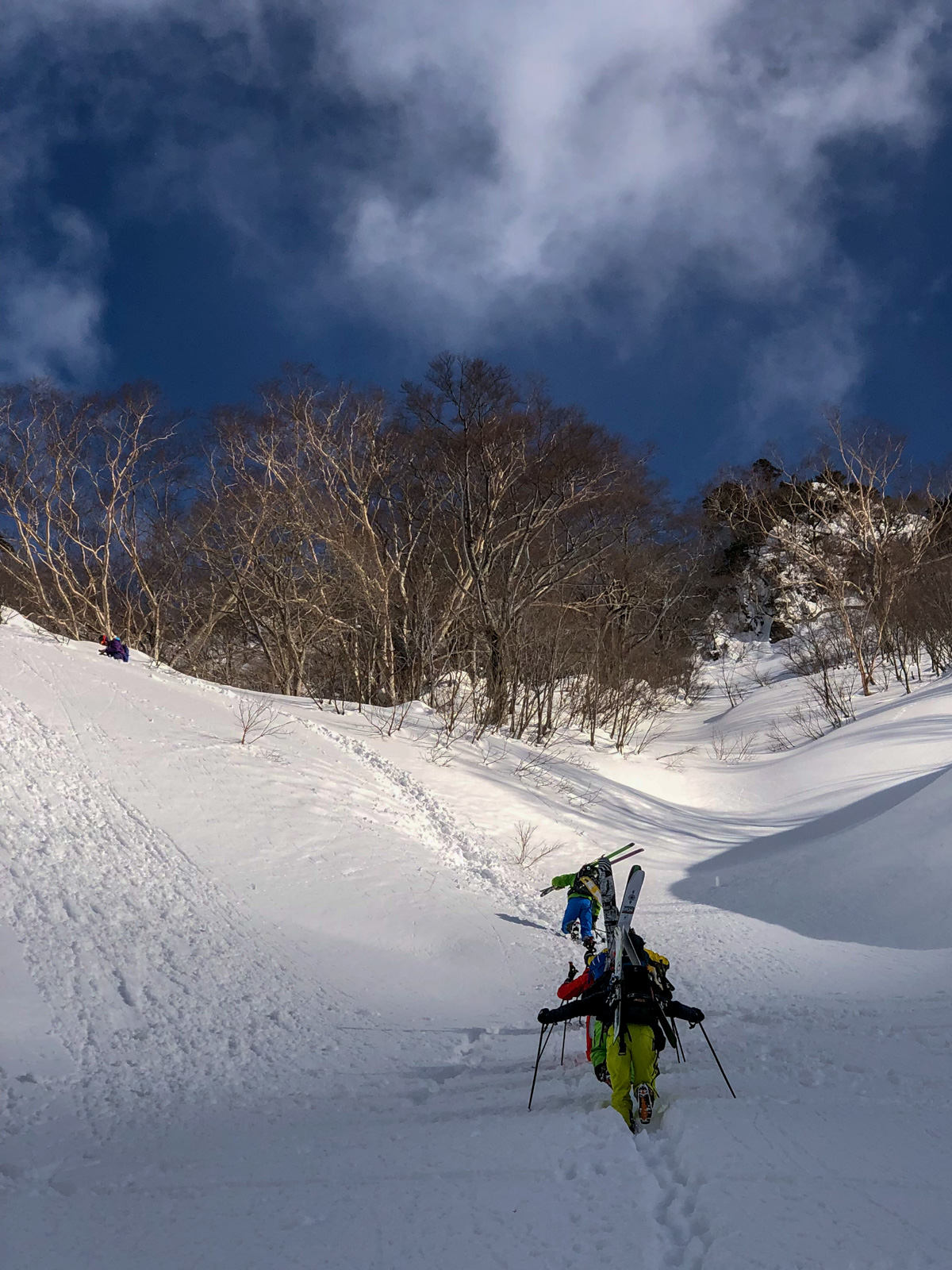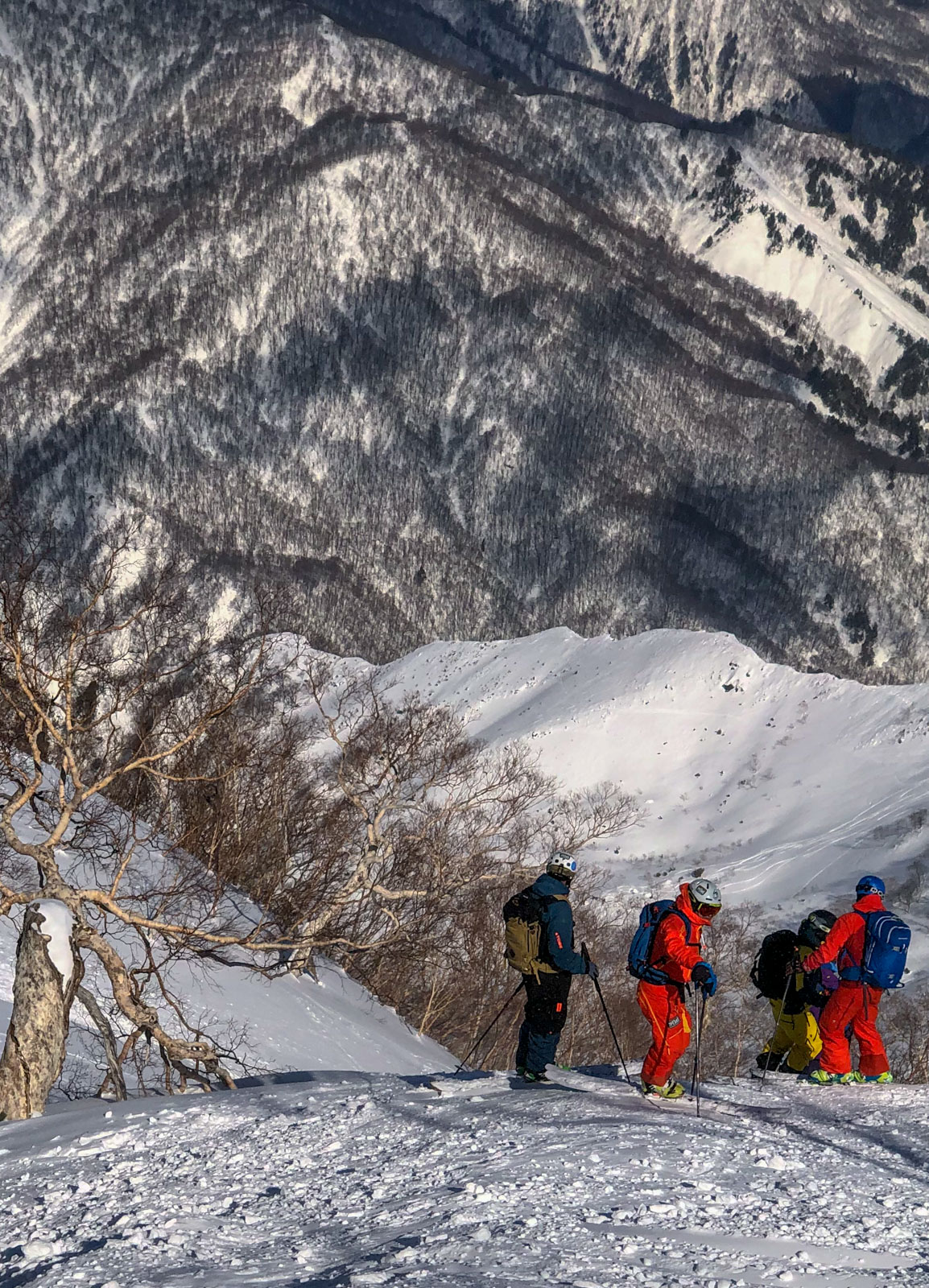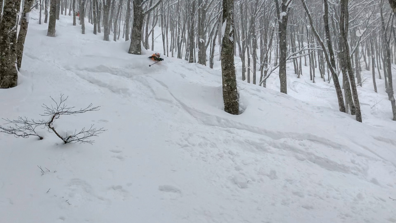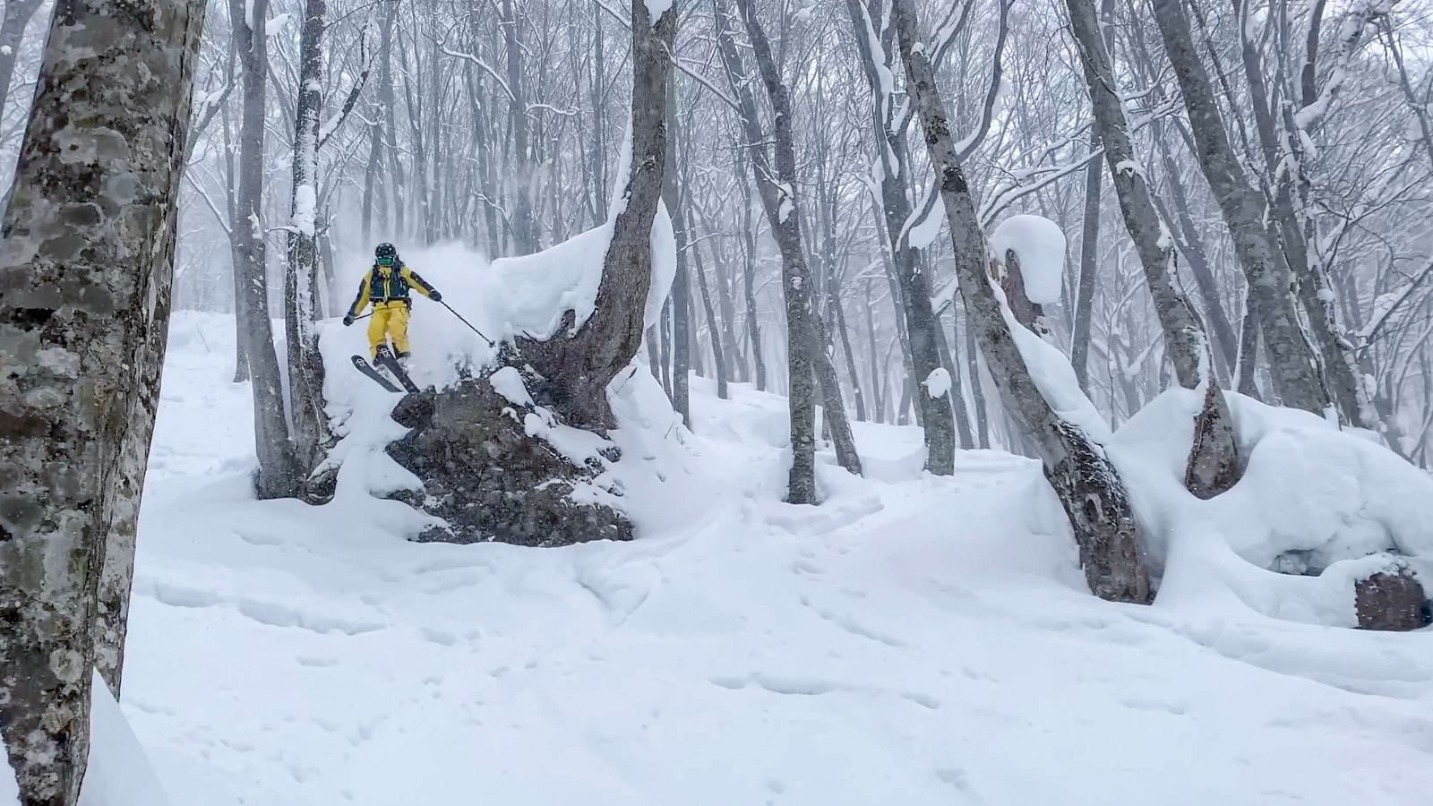 Du mercredi au vendredi, nous jouons ainsi dans les forêts de bouleaux. Quel bonheur de goûter à cette neige si légère et en si grande quantité. Le jeudi, un local nommé Schuichi, qui nous suit sur internet, se joint à nous pour nous faire découvrir un tour en peaux. Avec une météo qui se dégrade de plus en plus, une partie du groupe se retrouve alors dans la tempête. Une charmante expérience…
