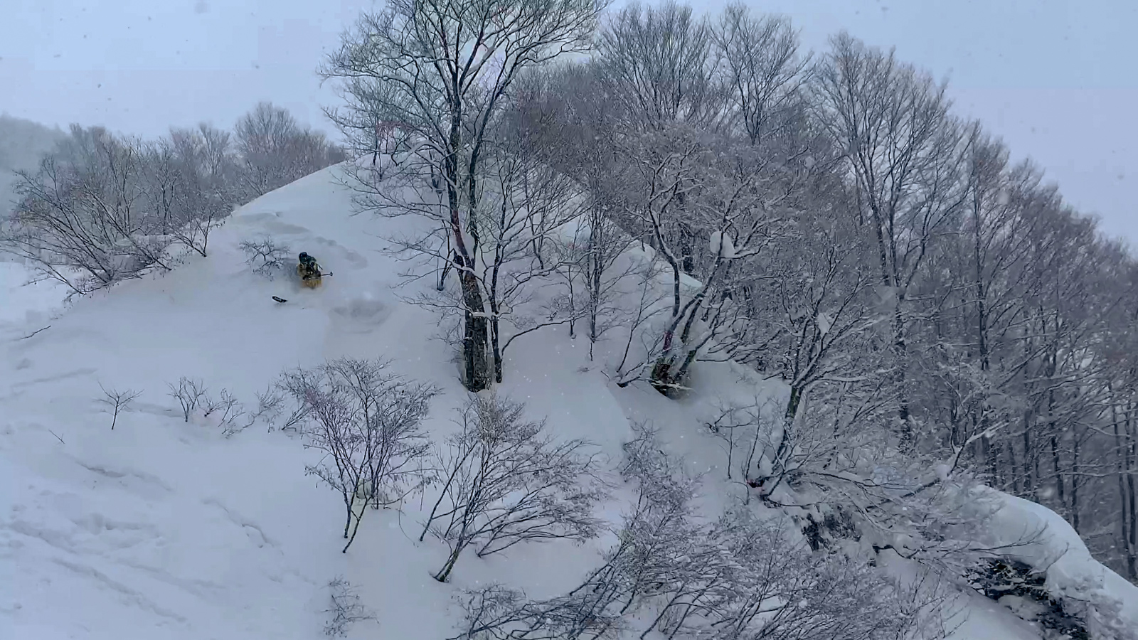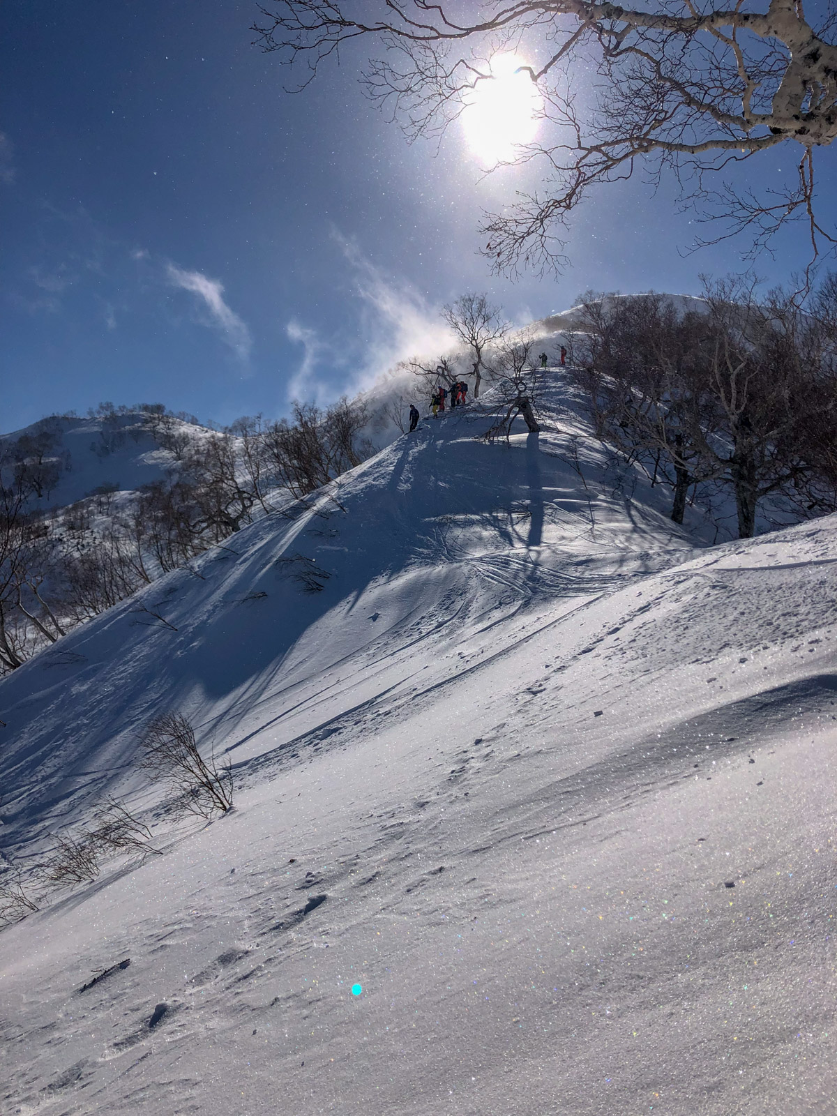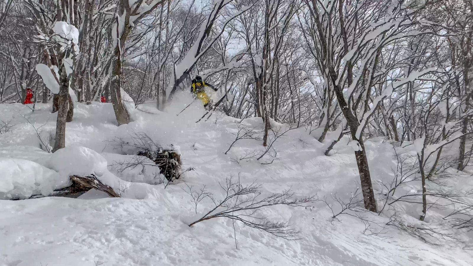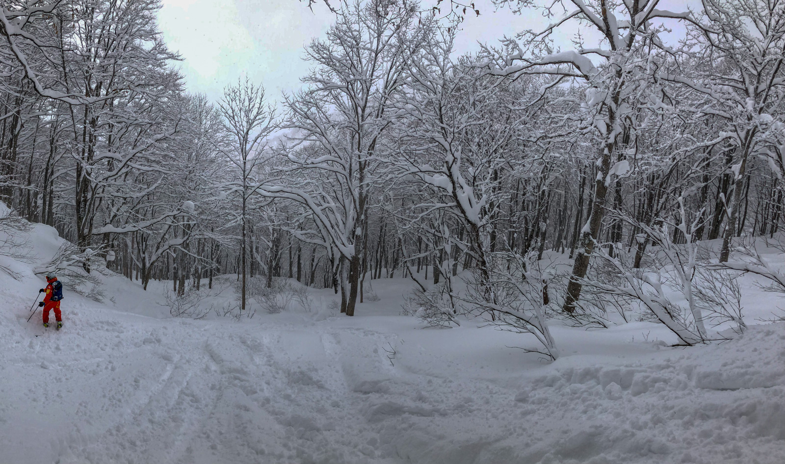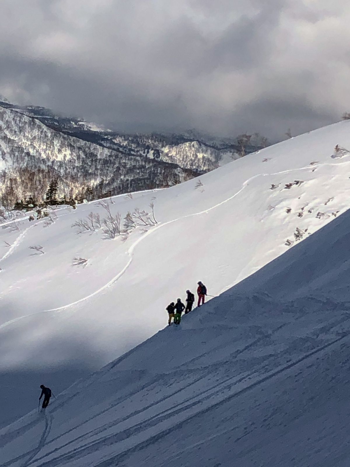 Du mercredi au vendredi, nous jouons ainsi dans les forêts de bouleaux. Quel bonheur de goûter à cette neige si légère et en si grande quantité. Le jeudi, un local nommé Schuichi, qui nous suit sur internet, se joint à nous pour nous faire découvrir un tour en peaux. Avec une météo qui se dégrade de plus en plus, une partie du groupe se retrouve alors dans la tempête. Une charmante expérience…