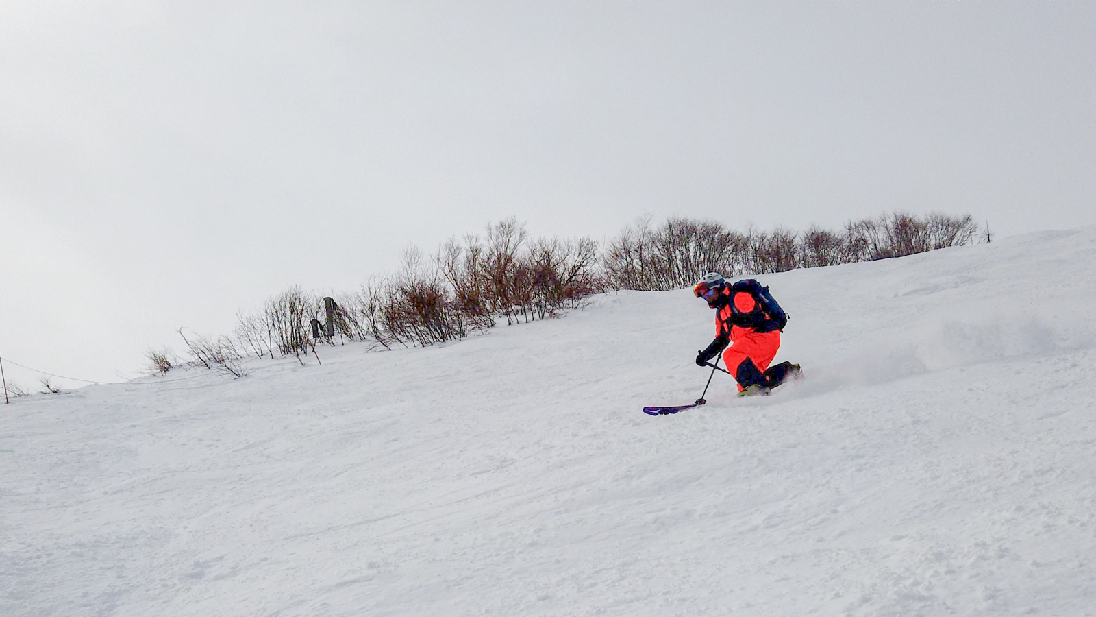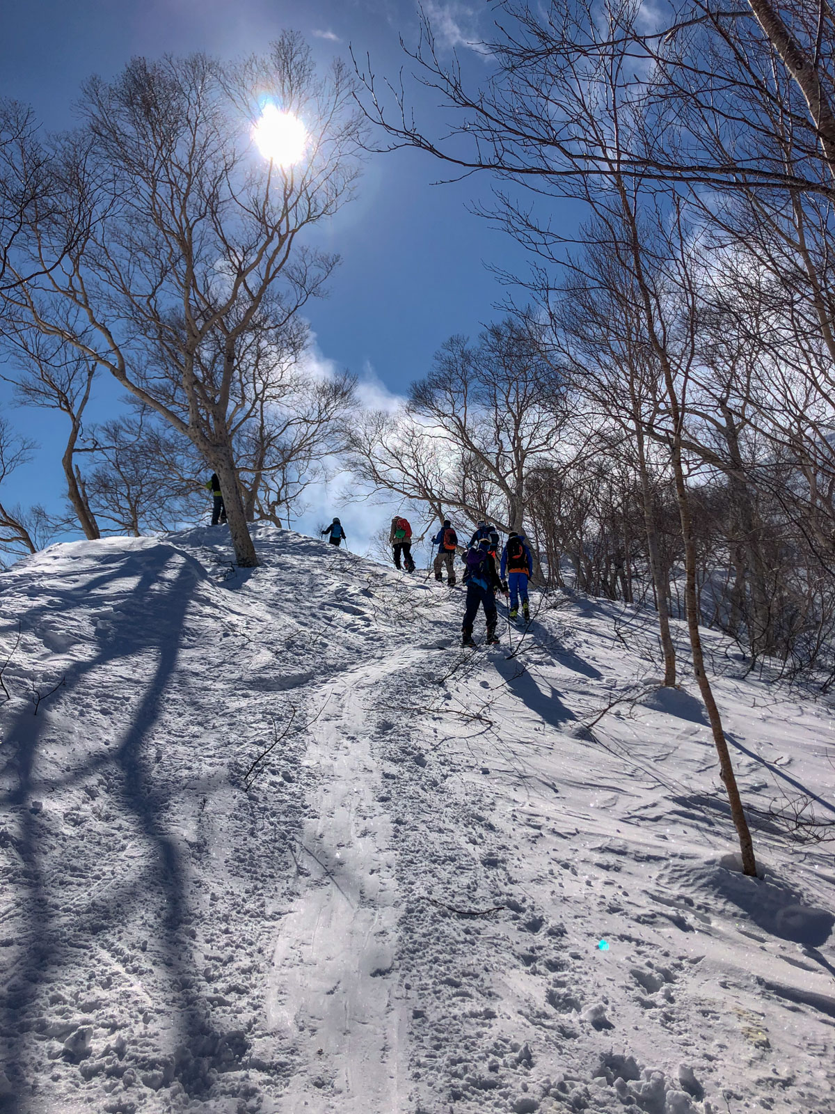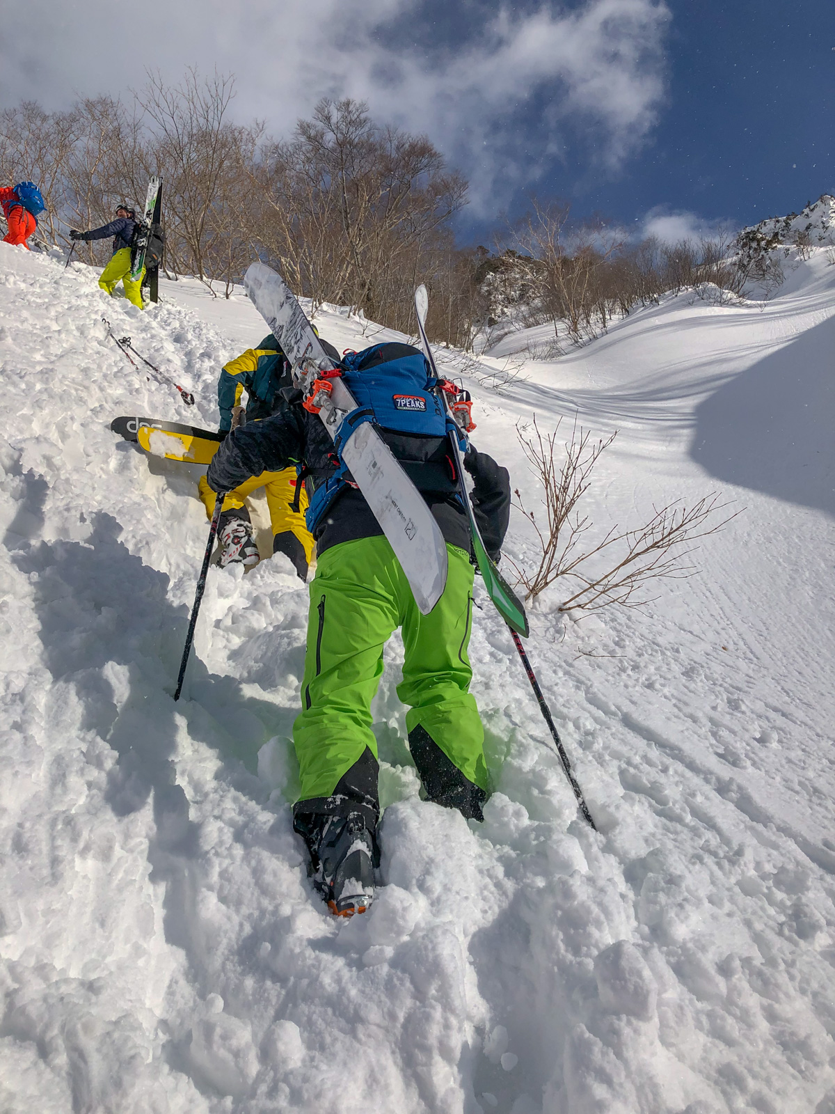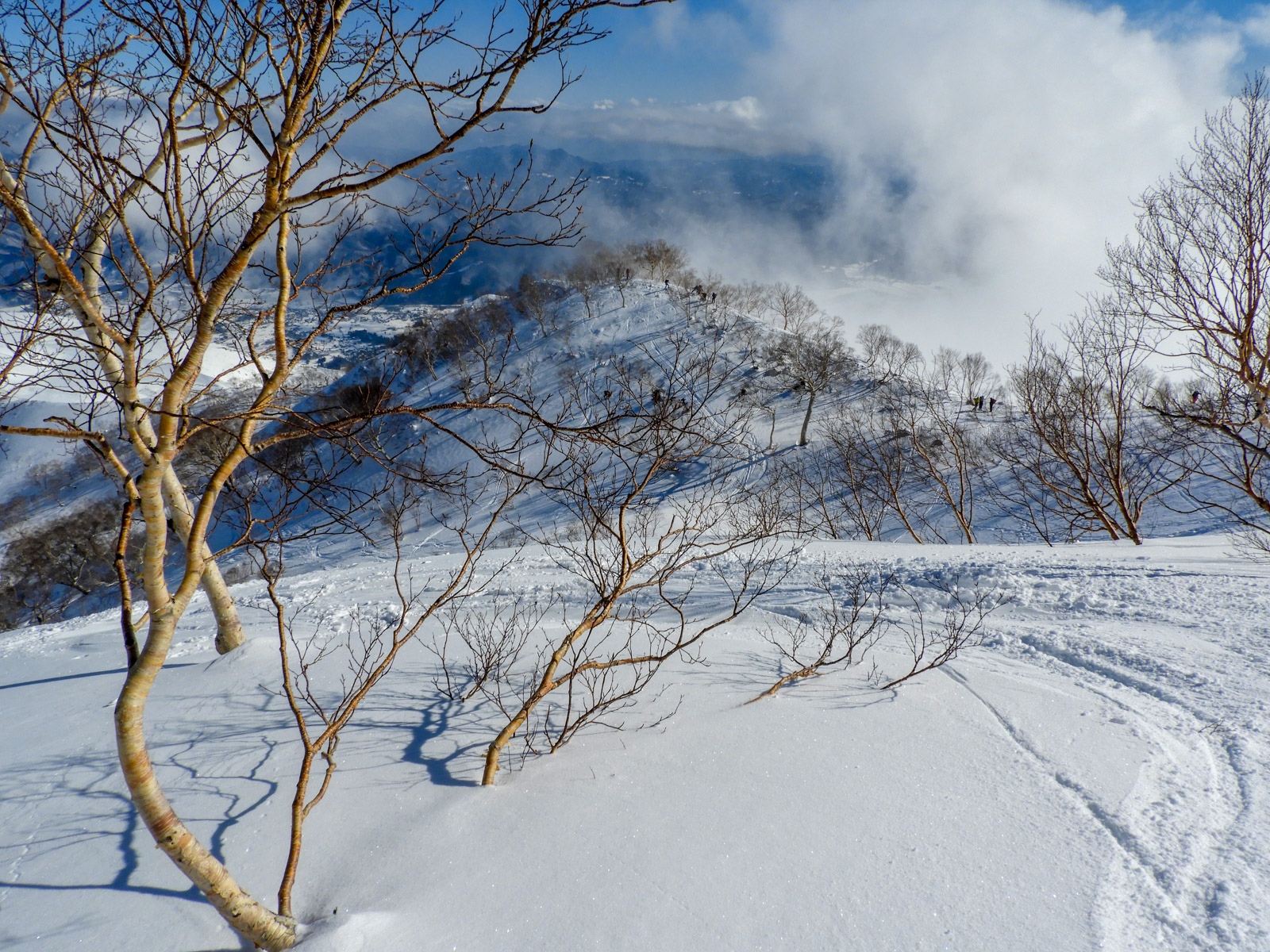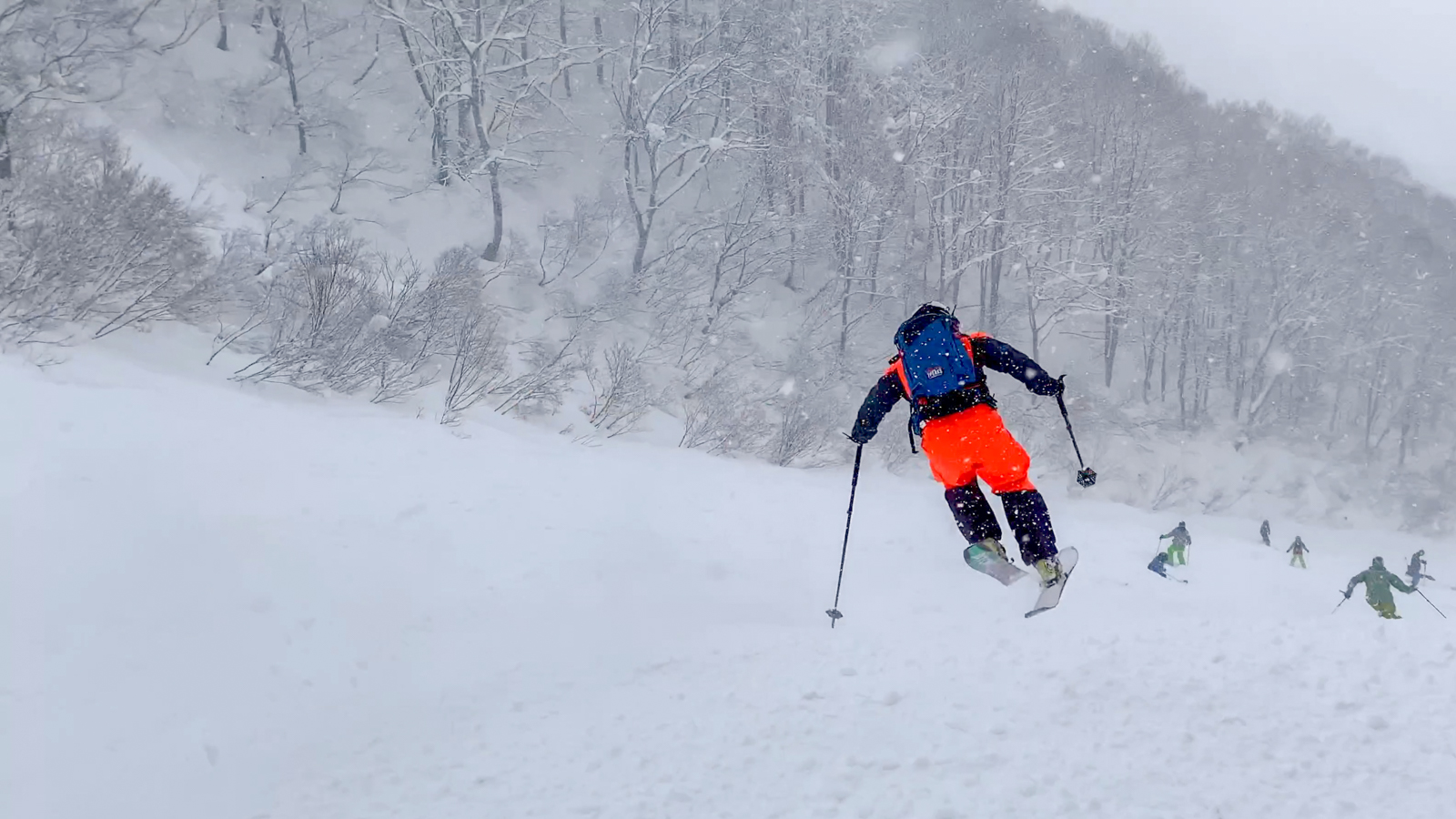 Du mercredi au vendredi, nous jouons ainsi dans les forêts de bouleaux. Quel bonheur de goûter à cette neige si légère et en si grande quantité. Le jeudi, un local nommé Schuichi, qui nous suit sur internet, se joint à nous pour nous faire découvrir un tour en peaux. Avec une météo qui se dégrade de plus en plus, une partie du groupe se retrouve alors dans la tempête. Une charmante expérience…